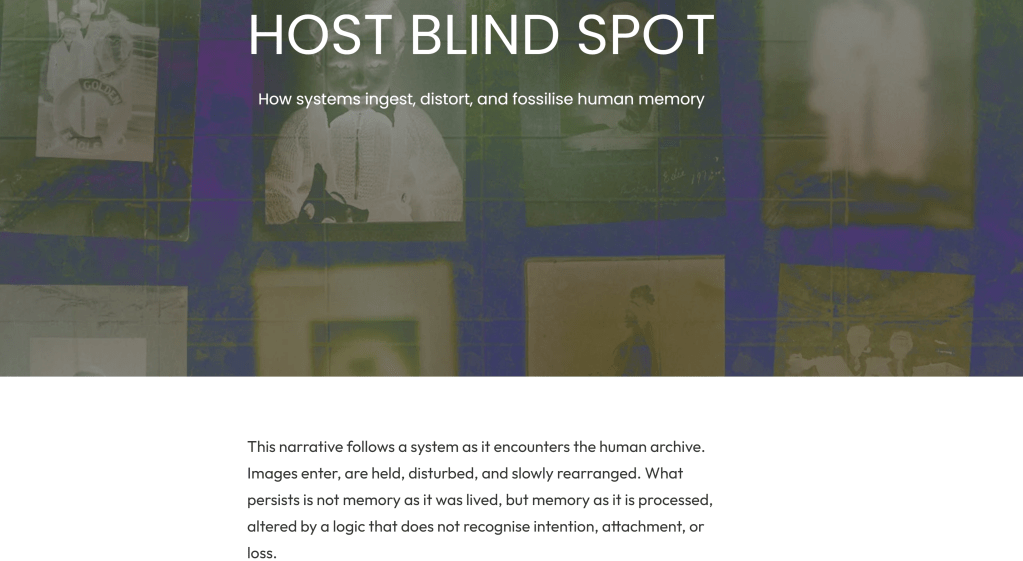 Host Blind Spot is a body of work combining video, generative systems, photography, and material experiments to examine how non-human processing reshapes memory, identity, and place.